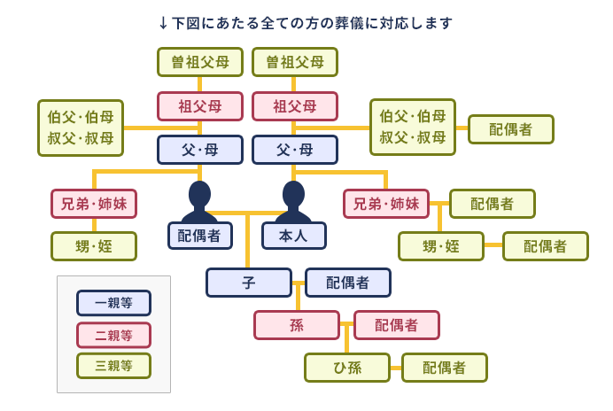 お申込み頂いたお客様の、ご家族・ご親戚のお葬式でも早割は対応します。三親等(曾祖父母・曽孫・おじ・おば・おい・めい)までが対応いたします。